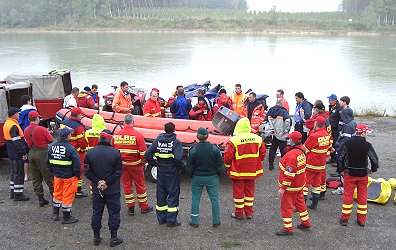 DLRG Eberbach bei internationaler Katastrophenschutzübung in Italien (Foto:DLRG)(jc) (ul) Wie können länderübergreifende Katastrophenschutzübungen durchgeführt werden, ist die Ausrüstung in verschiedenen europäischen Ländern vergleichbar oder wie sieht ein Kommunikationssystem aus, das im Ernstfall ein gemeinsames Arbeiten ermöglicht? Um diese Fragen beantworten zu können, sind Organisationen und Beobachter aus zehn Ländern (Belgien, Deutschland, Frankreich, Griechenland, Italien, Österreich, Portugal, Slowakei, Spanien und Ungarn) in Ferrara, Italien, zusammen gekommen. In dem von der EU geförderten Programm "Po 2005 Flood Emergency – Civil Protection – European Force" sind insgesamt knapp 1000 Personen engagiert. Vom 2. bis zum 9. Oktober arbeiten Wasserrettungsdienste, Feuerwehren und Sanitäter zusammen, die in Ferrara von der Polizei, von Helikoptereinsatzkräften und vor allem auch von Verwaltungs- und Regierungsstellen unterstützt werden.