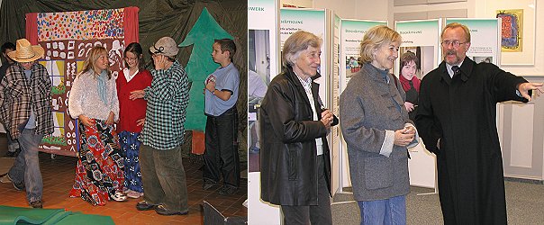 Engagierte Arbeit über acht Generationen gewürdigt Links: Kinder der Sonderschule Schwarzacher Hof führten das Singspiel Hänsel und Gretel auf, rechts: Geschäftsführer Reinhard Adler führte die Heidelberger Oberbürgermeisterin Beate Weber (Mitte) und deren Mutter durch die Ausstellung der Johannes-Anstalten Mosbach. (Fotos: privat)