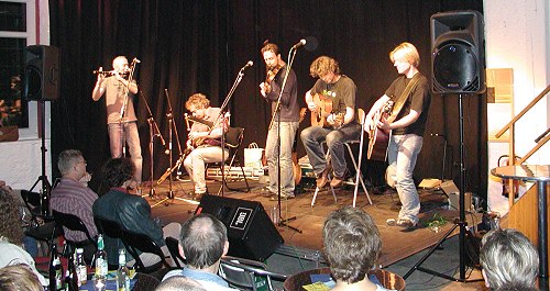 Europäische Interpretation irischer Gefühle (Foto:Claussen)(jc) Unter anderem mit Stücken aus ihrer im Februar erschienenen und in Fachkreisen hochgelobten CD "The Coming of Spring" hat die Band "Eitre" am vergangenen Freitag in der Galerie Artgerecht für gute Laune bei den hiesigen Freunden irischer Musikklänge gesorgt. Eitre, die "erweiterte" Version der in unserer Region bestens bekannten schwedischen Irish-Traditionell-Formation "Quilty", aus der Dag Westling und Esbjörn Hazelius mit von der Partie sind, wurde durch Frederik Bengtsson (Bass), Kevin Ryan (Flute) aus England und den Franzosen Marco Pollier (Uillean Pipes) verstärkt. Zum europäischen Quintett aufgestiegen bot "Eitre" ein furioses Spektrum an Klängen klassischer Irish-Music. Insbesondere Marco Polliers Spiel mit den Uilleann Pipes transportierte den liebenswerten Rhythmus dieser Band in die Kulturlabor Location.
