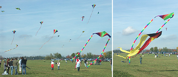 Große Drachen mussten unten bleiben Nicht immer reichte der Wind für die großen Drachen wie in unserem rechten Bild aus. Sehr selten konnte man auch so viele Drachen wie beim linken Bild am Himmel bestaunen. (Fotos:Baumgartner)
