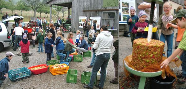 Bürgermeister und Gemeinderäte besuchten Aktion der Naturschutzjugend Die NAJU-Gruppe auf dem Hof Breitenstein. Die Kinder bestaunen den "Apfelkuchen" nach dem Pressen des Apfelsaftes. (Fotos: NAJU, Dr. Peter Sack)(tw) (ako) Die Kindergruppe der Naturschutzjugend Eberbach traf sich am vergangenen Samstag unter dem Motto "Vom Apfel zum Saft" auf dem Hof Breitenstein. Kinder, Betreuer und einige Eltern erlebten dabei praktisch mit, wie man Apfelsaft herstellt. Die Äpfel wurden zuerst gewaschen und klein geschnitten. Nebel, der die Sonnenstrahlen den ganzen Vormittag fernhielt, konnte den Arbeitseifer jedoch nicht bremsen. Unter geduldiger und motivierender Anleitung von Peter Pilz, der mit seiner Apfelpresse extra aus Langenthal angereist war, durften die Kinder die vorbereiteten Äpfel nun mahlen und pressen. Abschließend wurden alle Beteiligten von Hiltrud Rein vom Hof Breitenstein und ihren Helferinnen vorzüglich bewirtet. Kinder und Erwachsene konnten sich so nach der anstrengenden Arbeit bei Frikadellen, heißen Rindswürsten aus hofeigener Schlachtung, Brot und natürlich dem selbsterzeugten Apfelsaft stärken.