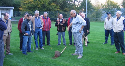 Am vorletzten Oktoberwochenende soll der Ball erstmals rollen Bauleiter Hans Steinacker zeigt dem Vereinsbeauftragten Andreas Huy (links mit Mappe) und zahlreichen Interessierten die Tiefe der Verwurzelung. (Foto:Grab)(jc) (cum) Der neue Rasenplatz der SG Rockenau ist fertig und bespielbar. Am frühen Mittwochabend nahmen Bauleiter Hans Steinacker und Vereinsbeauftragter Andreas Huy das 100.000-Euro-Projekt ab.