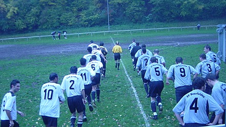 SVB behauptet die Tabellenführung (Foto: privat)(bro) (ge) Dank einem klaren 4:1-Erfolg bei Türk Breuberg verteidigte der SV Beerfelden am vergangenen Sonntag seinen Platz an der Sonne vor dem ersten Verfolger, der SG Erbach, die Gammelsbach knapp mit 2:1 niederhalten konnte. Bei zunächst strömenden Regen und dem bekannt schwer bespielbaren, tiefem Geläuf konnten die Breuberger nur in der Anfangsviertelstunde die Partie ausgeglichen gestalten. Der SVB legte letztlich mit der nötigen Einstellung und Aggressivität bereits in der ersten Halbzeit den Grundstein für diesen Auswärtserfolg: Nach 16 Minuten war es Tobias Bechtold, der im Anschluss an einen von Dennis Hemberger getretenen Eckball eine Kopfballvorlage von Markus Ihrig aus kurzer Distanz zur 1:0-Führung über die Linie drücken konnte. Nur wenig später schickte Libero Robin Hemberger Salih Kus mit einem weiten Ball auf die Reise, dessen Zuspiel verwertete erneut Tobias Bechtold – wenn auch im zweiten Versuch – gekonnt zum 2:0 (21.). Während sich die Heimelf in der Offensive gegen die sichere SVB-Hintermannschaft kaum durchsetzen konnte, waren die Mannen um Spielertrainer Christoph Karmowski durch schnell vorgetragene Spielzüge meistens brandgefährlich. So war es auch kaum verwunderlich, dass Salih Kus mit seinem Treffer zum 3:0 (nach Pass von Tobias Bechtold) bereits frühzeitig die Partie endgültig entschied (34.). Zu Beginn der zweiten Halbzeit genehmigten sich die Männer aus der Stadt am Berge dann leider eine knapp zehnminütige Auszeit, in der man die Zügel doch ein bisschen arg schleifen ließ. Just in dieser Phase gelang Chrüs Bella per Kopf dann auch gleich der 1:3-Anschlusstreffer (54.). Nach etwa einer Stunde folgte dann leider der unrühmliche Höhepunkt in dieser Partie: Markus Ihrig ließ sich zunächst nach einem der zahllosen Foulspiele an seiner Person zu einem Nachtreten verleiten - Beobachter sprachen von der klassischen Kurzschlussreaktion. Im Anschluss daran übten dann diverse Akteure der Heimelf eine mehr als intellektfreie Selbstjustiz aus, worauf Schiedsrichter Walter Puschkewitz nichts anderes übrig blieb, die die Kampfeinlagen zweier Breuberger Spieler und auch Ihrigs Nachtreten mit insgesamt drei roten Karten zu ahnden. Von nun an hatte der Schiedsrichter bei der Heimelf – vorsichtig formuliert - keinen allzu großen Stein mehr im Brett. Zweifellos lag er aber mit seinem Entscheidungen im Anschluss an die vollzogene Rudelbildung absolut richtig. In der 69. Minute entschied der Unparteiische dann nach einem Foulspiel an Salih Kus zurecht auf Strafstoß und verwies mit Kamil Demiröz (nach einer Spuckattacke gegen den Referee) den nunmehr dritten Akteur der Gastgeber vorzeitig zum Duschen. Martin Thiess zeigte sich indes von allem unbeeindruckt und versenkte den Murmel vom Punkt aus sicher und trocken zum 1:4. In der Folgezeit verpasste es der SVB, noch den ein oder anderen Treffer zu setzen und lief gegen die dezimierten Türken mehrfach ins Abseits. Unter dem Strich kann man aber mit der gezeigten Leistung durchaus zufrieden sein, die es bei den weiteren Aufgaben in den nächsten Wochen nun zu bestätigen gilt. Folgende Formation punktete in Sandbach gleich dreifach: Veith – Hemberger Robin – Wohlgemuth Thorsten, Brauch – Thiess, Jovanovic, Hemberger Dennis, Ihrig, Röchner (58. Eckhard) – Bechtold (87. Johe), Kus (79. Sasse).