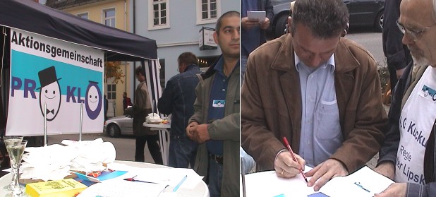 Gemeinsam für den Erhalt öffentlicher Toiletten Die neue Aktionsgemeinschaft sammelte Unterschriften. Auch Bürgermeister Bernhard Martin (rechts) gehörte zu den Unterzeichnern. (Fotos:Richter)(hr) "Pro Klo" heißt eine neue Aktionsgemeinschaft von Eberbacher Bürgerinnen und Bürgern, die am 6. November um 11.11 Uhr in der Stadthalle offiziell gegründet werden soll. Die Aktivisten treibt eine gemeinsame Sorge um: Dass nämlich, nachdem einige öffentliche Toiletten in Eberbach geschlossen werden sollen, die "Haagseicher" wieder im Kommen sein könnten.