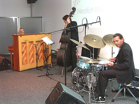 150 Jazz-Fans waren begeistert Das "Anke Helfrich Trio" begeisterte die Zuhörer bei seinem Auftritt in Strümpfelbrunn bei der Firma Mosca. (Foto:Baumgartner)(tb) Am Freitag präsentierten die Eberbacher Jazztage am Neckar und im Odenwald, kurz "JazzMe" genannt, das "Anke Helfrich Trio" in der Maschinenfabrik Gerd Mosca in Waldbrunn-Strümpfelbrunn. Musik an außergewöhnlichen Orten zu bringen, das hatten sich die Veranstalter vorgenommen. International renommierte Künstler spielten in den Hallen einer international tätigen Firma. Dass dies auch bestens ankommt, wurde in Strümpfelbrunn eindrucksvoll bewiesen. Rund 150 Musikfans, darunter die Bürgermeister Bernhard Martin (Eberbach) und Klaus Schölch (Waldbrunn), sowie die Firmeninhaber Gerd und Timo Mosca zeigten sich vom "Anke Helfrich Trio" begeistert. "Mosca meets Jazz", stand in großen Lettern über der Bühne, als die drei Musiker zeigten, was Jazz sein kann. Die Stücke des Trios waren ganz der aktuellen Postmoderne verschrieben, wobei Anke Helfrich auch Eigenkompositionen zu dem umfangreichen Konzertprogramm beisteuerte. Mit im Team der Pianistin Anke Helfrich war die Rhythmusgruppe, bestehend aus dem Drummer Dejan Terzic und dem Bassisten Martin Gjakonovski.