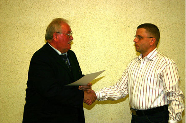Norbert Sigmund nahm Auszeichnung entgegen Bürgermeister Roland Schilling (l.) übergab die Auszeichnung an Norbert Sigmund vom AKA Schönbrunn. (Foto:Böhm)(ub) "Schönbrunn ist nicht so am Ende der Welt, dass man die zahlreichen Aktivitäten der einzelnen Vereine nicht bemerkt", erklärte Bürgermeister Roland Schilling mit Stolz. In der vorliegenden Chronik habe der Alternative Kommunalpolitische Arbeitskreis, auch "AKA" genannt, in den vergangenen Jahren viel ehrenamtliches Engagement gezeigt. Neben der Überdachung des Allemühler Spielplatzes und der Organisation einiger Open-Air-Konzerte sei es in Schönbrunn gelungen, eine über die Region hinaus bekannte Skateranlage einzurichten. Regierungspräsident Dr. Rudolf Kühner habe als Dank für das AKA-Engagement unter der Leitung von Norbert Sigmund eine Urkunde parat, die Schilling gerne an Sigmund überreichte. Sigmund freute sich über diese Auszeichnung und dankte auch der Gemeindeverwaltung für die Unterstützung.