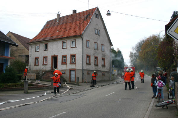 Vor Ort sahen sich die eintreffenden Wehrmänner mit einer "Übungslage" konfrontiert, nach der spielende Kinder in dem leer stehenden Haus gezündelt hatten. Dabei brach ein Brand aus, durch den das ganze Haus verqualmt war. Die Kinder wurden noch in dem brennenden Haus vermisst. Während von den beiden Fahrzeugen aus sofort die Wasserversorgung aufgebaut wurde, drangen die ersten Feuerwehrmänner mit Atemschutzausrüstung in das Haus ein, um die Vermissten zu retten. Schon nach kurzer Zeit wurden sie fündig und konnten einen "Verletzten" aus dem Gefahrenbereich bringen. Gleichzeitig gingen andere Trupps mit C-Schläuchen gegen die Brandherde im Haus vor.
