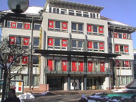 Rathaus wird zum Adventskalender Noch sind alle Fenster am Rathaus geschlossen. (Foto:Richter)(hr) Zum ersten Mal in Eberbach wird es in diesem Jahr einen "lebendigen" Adventskalender geben. An jedem Tag vom 1. bis 24. Dezember wird um 17 Uhr ein Fenster des Rathauses am Leopoldsplatz geöffnet. Gruppen der katholischen und evangelischen Kirchengemeinden haben die einzelnen Fenster gestaltet, und werden auch am jeweiligen Tag das Öffnen "ihrer" Fenster mit Musik und Texten umrahmen. Gemeinsam werden auch Adventslieder gesungen.