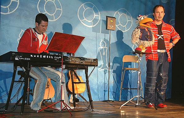Arche präsentierte Christmas Party mit dem Kinderkünstler Daniel Kallauch als Bauchredner mit Spaßvogel "Willibald" und Pianist Markus Herzer. (Foto:Wörner)(tw) Über 600 Kinder, zum Teil in Begleitung Erwachsener, waren gestern Nachmittag in die Stadthalle zur "Christmas Party" mit Daniel Kallauch gekommen. Mitgebracht hatte Kallauch seinen Hausmeister "Ernst Engel", der für Ordnung sorgte, und zur musikalischen Unterstützung den Pianisten und Mitstreiter Markus Herzer. Selbstverständlich mit von der Partie war auch Spaßvogel Willibald, der für gelegentliche Auftritte seinem "Kofferraum" entstieg.