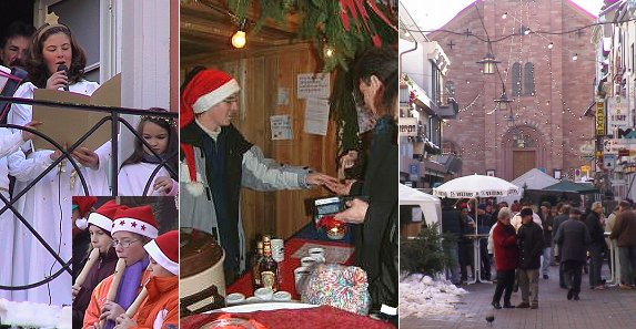 Eberbach hüllt sich in vorweihnachtliches Flair (Fotos:Richter/Wörner)(hr) Mit der "Advents-Straße" und dem Weihnachtsmarkt der Vereine startete Eberbach gestern und heute in die Adventszeit. In der Bahnhofstraße waren Buden und Verkaufsstände aufgebaut, an denen Geschäfte, Vereinigungen und Einrichtungen ihre Produkte anboten. Am heutigen Sonntag hatten auch die Geschäfte geöffnet und zum Einkaufsbummel eingeladen.