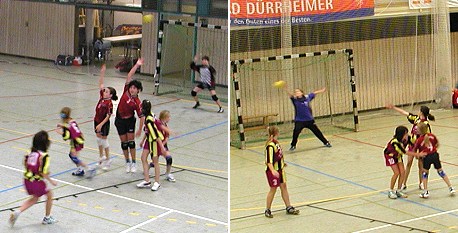 Unerwartete Schlappe der weiblichen SGH-D-Jugend in St Leon Sowohl in Abwehr (l.) als auch im Angriff (r.) blieb man ohne das nötige Selbstvertrauen weit hinter den Erwartungen zurück, auch wenn die beiden Szenen im Bild jeweils erfolgreich für SGH verliefen. (Fotos:Claussen)