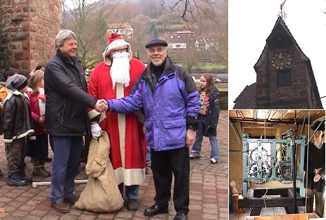 Uhr im Pulverturm schlägt wieder Bürgermeister-Stellvertreter Günter Wiedemer (l.) mit Günter Lipski vom Bürger- und Heimatverein und dem Nikolaus bei der heutigen Inbetriebnahme der Uhr im Oberstübchen des Pulverturms (Bilder rechts). (Fotos:C.Richter/Richter)(cr) Dass der Nikolaus zu braven Kindern kommt und ihnen Geschenke bringt ist hinlänglich bekannt. Dass er aber auch der Stadt Eberbach und damit den Bürgerinnen und Bürgern ein Geschenk überbringt ist eher eine Seltenheit. Dennoch durfte heute Bürgermeister-Stellvertreter Günter Wiedermer ein besonderes Präsent vom Bürger-und Heimatverein der Stadt Eberbach entgegennehmen. Vorsitzender Günter Lipski und weitere rührige Vereinsmitglieder hatten heute gegen 12 Uhr zu einem kleinen Umtrunk vor dem Pulverturm eingeladen. Der Grund für dieses Fest war die Uhr des Turms. Sie wurde im Jahr 1766 vom Eberbacher Uhrmacher Franz Jakob Braun eigentlich für den Obertorturm bei der evangelischen Kirche gefertigt. Von hier kam sie in den Untertorturm, der zwischen dem Thalheimschen Haus und der Polizei stand. Als auch dieser 1884 weichen musste, wurde die Turmuhr in das Turmzimmer des Mantel -oder Pulverturms versetzt. Der Bürger- und Heimatverein ließ die Uhr 1997 überholen und die Zifferblätter neu vergolden. Ziel des Vereins war es, die Glocke wieder schlagen zu lassen. Da man aber mit Schwierigkeiten wegen der Lautstärke aus einem benachbarten Hotel zu rechnen hatte, wurde nach einer "Klanghöprobe" mit dem Gemeinderat in einer anschließenden - sogar nichtöffentlichen - Gemeinderatsitzung beschlossen, dass die Uhr wieder schlagen darf. Und das tut sie auch ab heute: Pünktlich um 12 Uhr schlug sie zwölf Mal lautstark.
