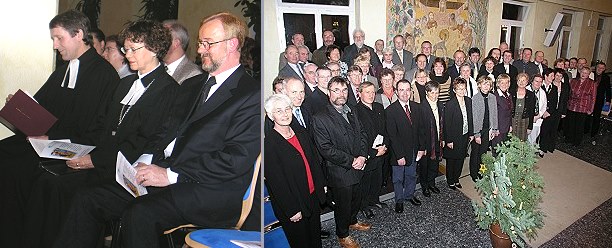 Höchste Diakonie-Auszeichung für 80 Mitarbeiter der Johannes-Anstalten Links: Prälatin Ruth Horstmann-Speer mit Pfarrer Richard Lallathin( li.) und Geschäftsführer Reinhard Adler. Rechts: Die Kronenkreuzempfänger 2005. (Fotos: privat)(bro) (ap) In einem feierlichen Gottesdienst mit Prälatin Ruth Horstmann-Speer wurde am Freitag 80 Mitarbeiterinnen und Mitarbeitern der Johannes-Anstalten Mosbach das goldene Kronenkreuz verliehen, die höchste Auszeichnung, welche die Diakonie zu vergeben hat. Im Rahmen der Weihnachtsfeiern an den Standorten Mosbach und Schwarzach wurden zudem Ehrungen für das 25-jährige und auch für ein 40-jähriges Dienstjubiläum vorgenommen. Die feierliche Verleihung der Kronenkreuze findet im jährlichen Wechsel an den Standorten Mosbach und Schwarzach statt, dieses Mal im Rahmen eines Gottesdienstes im Luthersaal auf dem Schwarzacher Hof, den Prälatin Ruth Horstmann-Speer am vergangenen Freitag zusammen mit Pfarrer Richard Lallathin hielt. Ruth Horstmann-Speer stellte den christlichen Auftrag der Johannes-Anstalten in den Mittelpunkt ihrer Predigt. Dieser Auftrag zeige sich in ganz besonderer Weise "im Umgang miteinander und mit den Menschen, die uns anvertraut sind". Seine Erfüllung sei nicht immer einfach, dafür brauche jeder immer wieder Kraft und Ermutigung. Ausgehend von Jes. 43,19 ("Siehe, ich will ein Neues schaffen") rief die Prälatin verschiedene Beispiele von Neuanfängen in der Bibel in Erinnerung. An diese Zusage Gottes "wollen wir uns immer dann erinnern, wenn er uns vor neue Herausforderungen stellt". Bei der anschließenden Mitarbeiterweihnachtsfeier in der Schwarzach-Halle, zu der auch Bürgermeister Theo Haaf gekommen war, sprach Geschäftsführer Reinhard Adler den Mitarbeitenden seinen ganz besonderen Dank für ihren hervorragenden Einsatz in den verschiedensten Bereichen aus. Er blickte auf die zahlreichen Veranstaltungen im Jubiläumsjahr 2005 zurück – "ein Kraftakt" – und stellte fest, dass sich die Johannes-Anstalten im 125. Jahr ihres Bestehens gut in der Öffentlichkeit präsentiert hätten. Trotz nicht guter Rahmenbedingungen seien die Johannes-Anstalten auch 2005 platzmäßig noch recht gut ausgelastet und mit Arbeit reich gesegnet gewesen. "Es ist unser gemeinsamer Auftrag, als soziales Unternehmen in der Diakonie für Menschen Leistungen und Dienste zu unterhalten und nach Möglichkeit zeitgemäß weiterzuentwickeln, die auf Hilfe, Begleitung, Unterstützung und Assistenz angewiesen sind", sagte Adler. Adler ging auch auf eine Satzungsänderung im Hinblick auf den Zweck der Johannes-Anstalten ein. Diese könnten nun über Leistungen für Menschen mit Behinderungen hinaus auch Angebote für "Menschen mit vergleichbarem Unterstützungsbedarf" machen, z.B. über Kooperationen im Pflege- oder im Krankenhausbereich. Dies wurde auch in das Leitbild der Johannes-Anstalten eingebaut, das nun nach einem mehrjährigen Diskussionsprozess verabschiedet wurde. Als "Vision" wird darin formuliert, dass "Menschen mit ihren unterschiedlichen Begabungen und Fähigkeiten in unserer Einrichtung sowie in den Kommunen und Kirchengemeinden gleichberechtigt miteinander leben und voneinander lernen." Diese Vision, so Adler, sei in den schwärzesten Zeiten der Johannes-Anstalten, im Nationalsozialismus, mit Füßen getreten worden. "Aber auch in der heutigen Zeit, wo die Unterstützung von Menschen mit Behinderungen von vielen draußen eher als reiner Kostenfaktor gesehen werde, können wir feststellen, dass wir noch ein gutes Stück entfernt sind von dieser Vision. Wir wollen aber - trotz aller Finanzprobleme - an diesen Zielen festhalten", betonte Adler. Der Geschäftsführer streifte auch die 125-jährige Geschichte der Johannes-Anstalten, die sich über sechs Generationen hin entwickelt habe. Ab 2005 müssten sie sich neuen Herausforderungen stellen. Als Stichworte nannte Adler: Kommunalisierung in der Finanzierung in der Behindertenhilfe, Umsetzung des Paradigmenwechsels mit Bildung neuer, schlankerer und vor allem ambulanter Wohnangebote, Ausbau des persönlichen Budgets usw. Als einen der "entscheidenden Mitstreiter", der sich im Neckar-Odenwald-Kreis für die Belange von Menschen mit Behinderungen einsetze, würdigte Adler in diesem Zusammenhang den Schwarzacher Bürgermeister Theo Haaf. Den "Weihnachtspsalm" des kürzlich verstorbenen Kabarettisten Hanns Dieter Hüsch zitierte Pfarrer Richard Lallathin, und über den Begriff "Erfolg" philosophierte der Vorsitzende der Gesamtmitarbeitervertretung, Walter Berroth. Erfolg werde von jedem anders wahrgenommen. Erfolgreich könne die Einrichtung nur dann sein, wenn jeder Beteiligte seinen Erfolg habe. Bereits eine Woche zuvor waren im Rahmen der Mitarbeiterweihnachtsfeier in Mosbach die dortigen Dienstjubilare geehrt worden. Adlers ganz besonderer Dank galt den Küchencrews beider Standorte, die sich wieder einmal selbst übertroffen hatten sowie für die musikalische Gestaltung der Weihnachtsfeiern dem Bläser- und Paukenensemble unter Leitung von Hubert Schäfer in Mosbach sowie dem Posaunenchor Aglasterhausen-Unterschwarzach unter Leitung von Frieder Wittmann in Schwarzach.