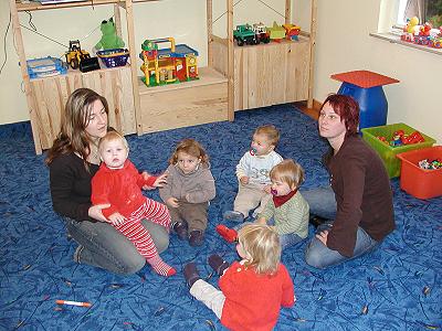 Kinderkrippe Rappelkiste in Zwingerstraße umgezogen Hausleiterin Julia Neuner (li.) und Mitarbeiterin Sibylle Erb bei der Betreuung (Foto:Claussen)