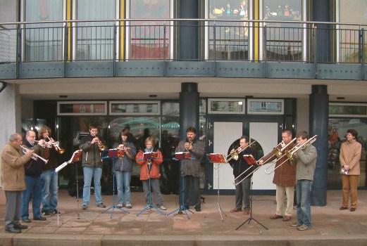 Posaunenchor gestaltete den Abschluss (Foto:Wörner)(tw) Eine große Schar Neugieriger war heute Vormittag zum Leopoldsplatz vor das Rathaus gekommen, um dabei zu sein wenn das 24. Türchen bzw. Fenster am großen Eberbacher Adventskalender geöffnet wird. Zum Vorschein kam ein Krippenmotiv. Pfarrerin Sabine König bedankte sich bei allen die bei der Ausgestaltung der Fenster mitgeholfen hatten, den Gruppen, die eine Patenschaft für ein Fenster übernommen hatten und nicht zuletzt der Stadt, welche sich um die Technik gekümmert und unter anderem die Fenster ins rechte Licht gerückt hatte. Wie das Öffnen des ersten Fensters und einige Male dazwischen, begleitete der Posaunenchor auch das Öffnen des letzen Fensters musikalisch. "Mache dich auf und werde Licht" als dreistimmigen Kanon sang Pfarrerin König auch heute wieder zum Schluss mit allen Besuchern.