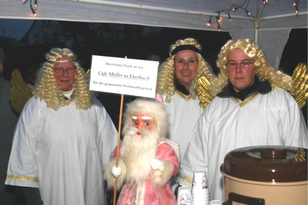 Drei Engel für...Allemühl Die drei Allemühler Engel Ute Kessler, Dorle Stellner und Nicole Kessler sorgten auf dem Allemühler Dorfplatz für gute Laune am Glühweinstand, ehe die Musikkapelle Allemühl Weihnachtslieder spielte. (Foto: Böhm)(ub) Vor zwei Jahren hatten drei Engel in Allemühl eine tolle Idee- vom Erlös des Glühweinverkaufes sollten die Musikanten der Allemühler Blaskapelle, die traditionell in jedem Schönbrunner Ortsteil an Heilig Abend aufspielen, verköstigt werden.