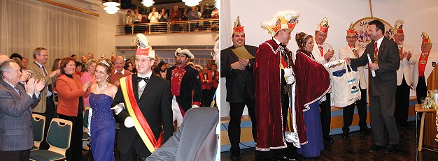 Prinzenpaar übernimmt Amtsgeschäfte von Bernhard Martin (Fotos:Claussen)(jc) Im Rahmen des Neujahrsempfangs der KG Kuckuck musste am Abend Bürgermeister Bernhard Martin die Amtsgeschäfte bis Aschermittwoch in neue Hände legen. Ab sofort lenkt "Prinz Markus I, Großherzog von Gratzert und Steige" gemeinsam mit "Ihrer Lieblichkeit Prinzessin Julia I, Markgräfin vom Scheuerberg, Schäferkönigin vom Gässel, Edle von Ballett und Tanz" die Geschicke der Stadt. Gleich zu Beginn der Regentschaft, des mit bürgerlichem Namen als Julia Schäfer und Markus Scheurich bekannten Paares, wurden traditionell die markantesten Veränderungen in der städtischen Verwaltung bekannt gemacht. Ohne Sparzwänge geht es dabei auch bei der KG Kuckuck nicht. So wird beispielsweise die "Traube", bekanntlich seit geraumer Zeit in städtischer Hand, wiedereröffnet, allerdings muss aus Kostengründen Bernhard Martin dort den Kochlöffel schwingen. Auch die öffentlichen Toiletten sieht man eher als potentielle Einnahmequellen. Neben dem ursprünglichen Zweck soll das Serviceangebot um Nagel- und Fußpflege sowie Hämorrhoiden-Wartung erweitert werden. Für diese Aufgabe soll Eberbachs letzte Toilettendame ihren Dienst wieder aufnehmen. Von Bürgermeister Bernhard Martin wurde dem Prinzenpaar der Rathausschlüssel sowie ein klappbarer Thron überreicht.