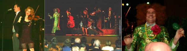 War des schee Boris Raderschatt erinnerte mit seinem Salonorchester Weimar an den allseits beliebten Filmschauspieler Heinz Rühmann. Gemeinsam mit Kirstin Deeken (Violine)und mit seinem kommunikativen Orchester brillierte er auch als Charly´s Tante und brachte die Eberbacher in Schwung. (Fotos: Böhm)(ub) Mit einem musikalischen Feuerwerk des mit dem Kleinkunstpreis "Ravensburger Kupferle 2003" ausgezeichneten Salonorchester Weimar neigte sich in der Stadthalle für viele Eberbacher das alte Jahr dem Ende zu.