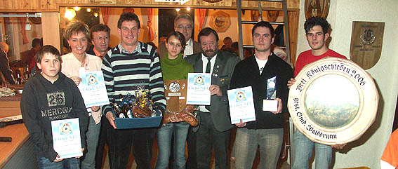 (tb) Sein traditionelles Dreikönigsschießen veranstaltete der Sportschützenverein Dielbach am Dreikönigstage wieder in seinem Schützenhaus. Teilgenommen hatten hierbei viele Mannschaften aus ganz Waldbrunn. Sie sorgten mit 255 Teilnehmern für einen neuen Teilnehmerrekord. Geschossen wurde auf Glücksscheiben, so dass auch weniger geübte Schützen zum Zuge kommen konnten. Für die kleinsten hatte man ein Lasergewehr aufgebaut. Wiederum hatte man viele Sachpreise, als ersten Preis gab es ein halbes Schwein, ausgelobt. Dementsprechend groß war auch der sportliche Ehrgeiz, mit dem die jeweils vier Schützen einer Mannschaft an den Schießstand gingen. Spannend war es dann bei der Siegerehrung, wo Schützenmeister Arnold Schreck sich zuerst bei allen Schützinnen und Schützen für ihre Teilnahme bedankte. Auch freute er sich aufrichtig, dass noch so viele Teilnehmer bei der Siegerehrung anwesend waren. Die Grüße der Gemeinde überbrachte dann Bürgermeister Klaus Schölch. Er lobte dabei die Arbeit der Vereine, die das Leben in der Gemeinde mitgestalten würden. Dann nahm Schützenmeister Arnold Schreck und Ortsvorsteher Herbert Bachert die Siegerehrung vor. Zuerst wurden die besten Einzelschützen verkündet. So stellte auch in diesem Jahr wieder die Mannschaft "Bierbrezel" den besten Einzelschützen. Es war dies Michael Mitmesser mit 147 Punkten. Anke Steck und Silke Wörner von den "Blinden Hühner" belegten mit 144, bzw. 143 Punkten die Plätze zwei und drei. In der Mannschaftswertung siegte bei den Damen erstmals der RSC Pferdeland Oberdielbach mit 529 Punkten. Die "Blinden Hühner" belegten mit 512 Punkten Platz zwei vor dem Reitclub Hoher Odenwald Strümpfelbrunn, der auf 486 Punkte kam. Bei den Herren gingen Platz eins und zwei wieder an dieselben siegreichen Mannschaften des Vorjahres. So konnten dann die Schützen vom "Bierbrezel" bei 544 erzielten Punkten den Wanderpokal erfolgreich verteidigen und das als Hauptpreis ausgelobte halbe Schwein für die Mannschaft mit dem besten Ergebnis mit nach Hause nehmen. Mit 516 Punkten belegte die Mannschaft vom SV Dielbach den zweiten Platz. Dritter wurde in diesem Jahr die "Ostwestfälischen Filzstiefelklopfer" mit 512 Punkten, die im letzten Jahr als vierter knapp einen Podestplatz verpassten. Bürgermeister Klaus Schölch konnte dann die von der Gemeinde Waldbrunn gestiftete Ehrenscheibe des Jahres 2006 an Stefan Schölch von der Mannschaft "Bierbrezel" überreichen. Auch er gewann diese schon im Jahre 2005
