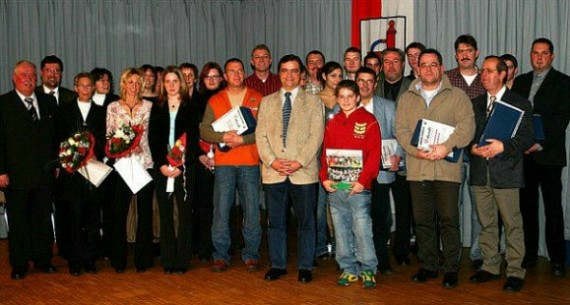 Erfolgreiche Sportler und ehrenamtlich Tätige geehrt Zahlreiche Sportler und ehrenamtlich tätige Menschen wurden für ihre Leistung von Bürgermeister Roland Schilling beim Neujahrsempfang ausgezeichnet. Allen voran die beiden Deutschen Meister Wolfgang Jung und Alexander Göhrig vom BSC Allemühl (Mitte). (Foto: Böhm)(ub) Einer langjährigen Tradition folgend ehrte Bürgermeister Roland Schilling beim 18. Neujahrsempfang der Gemeinde Schönbrunn wieder erfolgreiche Sportler und auch Mitbürger, die sich im vergangenen Jahr im Ehrenamt engagierten.