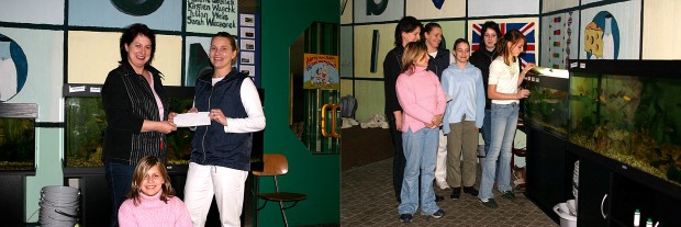 FAIRNESS spendet für Aquarien- AG Christiane Falckenthal von der FAIRNESS GmbH übergab der Aquarien-AG der Realschule eine Spende. (Fotos:Böhm)(ub) Einem schönen Brauch folgend, überlegten sich die beiden Geschäftsführerinnen der Eberbacher FAIRNESS- GmbH, Christiane Falckenthal und Brigitta Stephan, an welche Institution sie die alljährliche Weihnachtsspende ihrer 13 Mitarbeiter übergeben könnten. In diesem Jahr fiel ihnen die Auswahl leicht. Nach dem letztjährigen Spendenaufruf für die Aquarien- AG der Realschule Eberbach, in die auch Tochter Franziska zur Schule geht, überlegten die beiden Pflegedienstleiterinnen Falckenthal und Stephan nicht lange. Sage und schreibe 250 Euro übergab Christiane Falckenthal an die Initiatorin dieser Aquarien- AG, Petra Heckmann. Im wöchentlichen Rhythmus betreut jeweils ein Mädchen der sechsköpfigen Aquarien- AG die drei unterschiedlich voluminösen Süßwasserbecken, die mit Guppys, Skalaren, Barschen, Platys und anderen Exoten besetzt sind. Die drei Becken, die seit April 2005 im Pausenraum der Realschule aufgestellt sind, müssen täglich betreut werden. In der großen Pause warten die hungrigen Fische bereits freudig auf ihre Fütterung. Mit viel Engagement und unter Anleitung von Petra und Michael Heckmann werden auch die notwendigen Wasserwechsel und das Absaugen des Mulms durchgeführt. Alles in allem eine anspruchsvolle Aufgabe, bei der auch allerlei Kenntnisse über die biologischen und chemischen Prozesse notwendig sind. Zum Ausgleich für ihr Engagement werden die sechs Mädchen namens Duygu, Miriam, Vanessa, Franziska, Selina und Nadine mit einem Eintrag im "Quali-Pass" belohnt. Von der Spende der FAIRNESS GmbH will Petra Heckmann gemeinsam mit den Jung- Aquarianerinnen noch mehr Fische, Pflanzen und Steine für die Aquarien anschaffen. Zusätzlich will sie mit der Aquarien- AG demnächst einen Ausflug zur "Sealife- Ausstellung" in Speyer machen, um das Wissen der Mädels zu vertiefen.