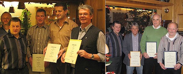 Winterfeier mit Ehrungen Rechts: 2. Vorsitzender Jürgen Reinwald mit den neuen Ehrenmitgliedern Klaus-Friedrich Braun, Franz-Josef König und Bernd Eckle (v.l.). Links: Jugendleiter Rainer Heckmann, 2. Vorsitzender Jürgen Reinwald mit Markus Kittel und Klaus Albert (40 Jahre) sowie Ulli Roh ( 25 Jahre)(v.l.). (Fotos: privat)