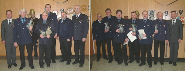 Der stellvertretende Kreisfeuerwehrverbandsvorsitzende Kurt Spiegel nahm gemeinsam mit Bürgermeister Martin die Ehrungen für 50-jährige Mitgliedschaft vor. Die Brüder Arnulf und Siegbert Münch erhielten hierfür vom Verband die Ehrennadel in Gold. Mit einem Rückblick und einer Vorschau in Bildern und Texten in Form einer PowerPoint- Präsentation, zum Teil ernsthaft aber auch humorvoll gespickt beendete Stadtbrandmeister Kubein den Abend.
