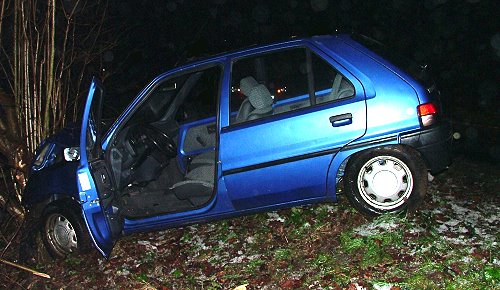 Fahrer wollte einem Fuchs ausweichen (Foto:Richter)(hr) Leichte Verletzungen zog sich ein 53-jähriger Eberbacher heute gegen 18 Uhr bei einem Unfall auf der L 2311 zu. Der Mann war mit seinem Peugeot auf dem Heimweg nach Friedrichsdorf, als er hinter Gaimühle wegen eines Fuchses auf der nassen Fahrbahn bremste und mit seinem Peugeot ins Rutschen geriet. Dabei kam das Auto nach links von der Fahrbahn ab und prallte gegen ein Gehölz unterhalb der Straße. An dem Kleinwagen entstand Totalschaden, der Fuchs kam mit dem Schrecken davon.