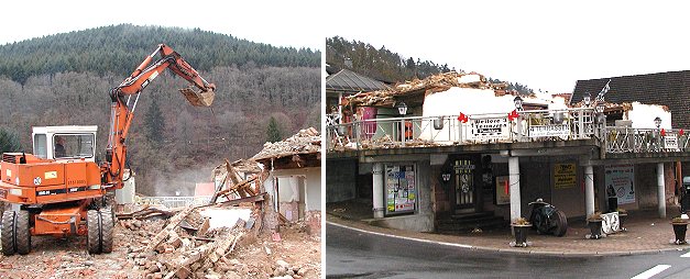 Abrissbirne für Hill Up - Neuaufbau soll zügig erfolgen (Fotos:Claussen)(jc) Das durch Fernsehberichte und Publikationen in Motorradzeitschriften bundesweit bei Motorradfans bekannte Kailbacher Motorcafe "Hill Up" wird derzeit abgerissen. Bei einem Großbrand im November(wir berichteten) war die Gaststätte von "Eddy Edelstahl" durch Feuer und Löschwasser so stark beschädigt worden, dass ein Abriss unumgänglich war. Eddy, mit bürgerlichem Nachnamen Biller, bekundete gestern aber gegenüber unserem Online-Magazin den festen Willen pünktlich zum Beginn der Motorradsaison wieder mit einem gastronomischen Angebot am Standort im Hessenecker Ortsteil vertreten zu sein. Ob der geplante Neubau bis dahin fertiggestellt ist, steht allerdings noch in den Sternen. Bisher liegt dem Wirt noch keine Baugenehmigung vor. Leuchtende Augen erglühen, als er seine Baupläne als Skizze in den Staub ritzt, auf die reellen Planungen angesprochen, steigt ihm die Zornesröte ins Gesicht, denn es geht ihm alles viel zu langsam. Trotzdem ist Biller zuversichtlich, dass nach endgültiger Fertigstellung des Bauantrages das Genehmigungsverfahren von der Baurechtsbehörde in Erbach zügig bearbeitet wird.