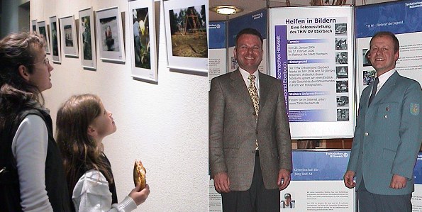 Bilder berichten über das Technische Hilfswerk Über 100 Fotos zeigen Entwicklung und Tätigkeiten des Technischen Hilfswerks. Rechts Bürgermeister Bernhard Martin und THW-Ortsbeauftragter Ulrich Schaffer bei der Ausstellungseröffnung. (Fotos:Richter)(hr) Einblicke in die Arbeit des Technischen Hilfswerks (THW) bietet eine Fotoausstellung, die derzeit im Eberbacher Rathaus gezeigt wird. Zusammengestellt hat sie der THW-Ortsverband Eberbach, der im Jahr 2004 sein 50-jähriges Bestehen feierte (wir berichteten). Im Foyer und den ersten beiden Obergeschossen schmücken 100 großformatige Bilder sowie etwa 15 Bilderserien die Wände des Rathauses. Die Bilder berichten von Übungen, Fortbildungen und Einsätzen des THW-Ortsverbands, die Eberbacher Helfer gerade in letzter Zeit auch immer wieder in weit entfernte Katastrophengebiete führten. Aber auch die personelle und technische Entwicklung des THW lässt sich aus den Fotos ablesen. Zusätzlich gibt es Info-Tafeln über die Aufgaben und Tätigkeiten des THW sowie verschiedene Broschüren und sogar eine CD-ROM über den Eberbacher Ortsverband.