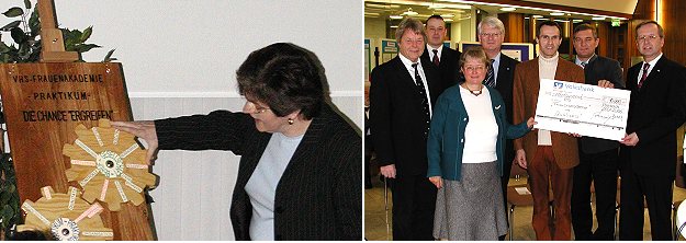 Volksbank Neckartal unterstützt Volkshochschule mit 10.000 Euro Präsentation ihres Studienschwerpunktes durch Kursteilnehmerin sowie (v.l.)Bürgermeisterstellvertreter Günter Wiedemer, Hauptamtsleiter Arndt Zimmermann, Frauenakademie-Organisatorin Renate Sperling, Volksbank-Vorstand Wilfried Herbold, VHS-Leiter Erol Weiß, Bürgermeister Horst Althoff aus Neckargemünd und Ekkehard Saueressig, stellvertretender Vorstandsvorsitzender der Volksbank Neckartal. (Fotos:Claussen)(jc) Die Volksbank Neckartal unterstützt weiterhin die Studiengänge der "Frauenakademie" und die Aktion "Qualipass" der Volkshochschule Eberbach-Neckargemünd. Mit der symbolischen Übergabe eines Schecks in Höhe von 10.000 Euro flankiert das Institut seine Förderprogramme in der Region, die sich auf einen Sponsoring- und Werbeetat von insgesamt 150.000 Euro summieren und nach Aussage von Vorstandsmitglied Ekkehard Saueressig auch im kommenden Geschäftsjahr in dieser Höhe aufrecht erhalten werden sollen. Der Leiter der Volkshochschule, Erol Weiß, und Renate Sperling, Koordinatorin der Frauenakademie, bedankten sich bei der Volksbank für die Unterstützung. Mit der Präsentation ihrer Studienschwerpunkte machten die Teilnehmerinnen der Frauenakademie auf ihre Projektarbeiten aufmerksam, die an Stellwänden noch bis zum 17. Februar zu den Öffnungszeiten der Schalterhalle in der Hauptstelle in Eberbach zu sehen sind.