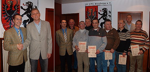 Mario Eitelbuß wurde Nachfolger von Ralf Heckmann Links: Ralf Heckmann übergibt den Vereinsvorsitz an seinen Nachfolger Mario Eitelbuß. Rechts die geehrten Mitglieder: Ex-Vorsitzender Ralf Heckmann, Wilhelm Zimmermann, Walter Ostertag, Karl Göhrig, Walter Rudolf, Hans Spindler, Karl Braus, 1. Vorsitzender Mario Eitelbuß und Erhard Zimmermann (v.l.). (Fotos: privat)(bro) (fw) Am Freitag lud der SV Moosbrunn seine Mitglieder zur jährlichen Mitgliederversammlung. Weit mehr als 50 Mitglieder waren der Einladung gefolgt und wählten im Rahmen der Veranstaltung mit Mario Eitelbuß einen neuen Ersten Vorsitzenden. Der aus beruflichen Gründen ausscheidende bisherige Amtsinhaber Ralf Heckmann eröffnete die Versammlung mit seinem Jahresbericht. In den vergangenen vier Jahren sei die Mitgliederzahl kontinuierlich gesunken. Auch im zurückliegenden Jahr nahm der Mitgliederbestand um 32 auf 418 ab. Heckmann begründete dies mit der rigoros durchgeführten Mitgliederbereinigung sowie mit Austritten, um den Vereinsbeitrag sparen zu können. Er betonte, dass Letzteres gerade heutzutage ein wichtiger Grund sei, der nicht verwerflich ist, aber gleichzeitig mahnte Heckmann, dass durch diesen Mitgliederschwund die Basis allen Wirtschaftens für den SV Moosbrunn, aber auch für andere Vereine, sich noch schwieriger gestalten wird. Das Sportjahr 2005 lässt sich aus Sicht der Fußball-Abteilung zweiteilen. Das erste Halbjahr begann sehr erfolgreich mit dem 2. Platz beim Eberbacher Hallenturnier, und in der Rückrunde der Vorsaison landete man nach einem furiosen Schlussspurt auf einem vierten Tabellenplatz, während das Reserveteam sich erneut die Vizemeisterschaft sichern konnte.