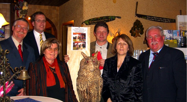 Höhepunkt des Abends war die wie in den Vorjahren von Willi Fischer äußerst vielseitig zusammengestellte Tombola mit zahllosen Preisen. Hierbei gewann jeder Teilnehmer mehrere Preise, mußte aber auch die eine oder andere Niete verkraften. Der Hauptpreis der Sonderverlosung, ein von Schatzmeister Hubertus Göhrig mit der Motorsäge "geschnitzter" Uhu muß sich dieses Jahr weder an einen neuen Ort noch an einen anderen Namen seines Besitzer gewöhnen, verbleibt er doch in Schönbrunn bei Heiderose Göhrig. Aus dem Erlös der Sonderverlosung und der Tombola wurden dieses Jahr 300 Euro für gemeindeeigene soziale Einrichtungen an Bürgermeister Roland Schilling übergeben.