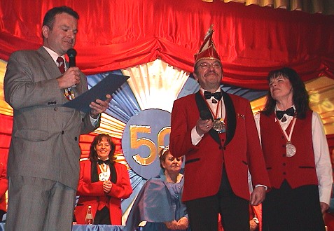 Lachender Eber für die Krawczyks Bürgermeister Bernhard Martin bei seiner Laudatio auf den "Club Eulenspiegel" und die "Doppelspitze" Roman und Barbara Krawczyk. (Foto:Richter)(hr) Dem 50-jährigen Bestehen des "Club Eulenspiegel" in Rockenau widmete Bürgermeister Bernhard Martin gestern den "Lachenden Eber", den Karnevalsorden der Stadt Eberbach. Dessen Präsident Roman Krawczyk und seine Ehefrau Barbara dürfen den Orden jetzt stellvertretend für den Club tragen, den sie als "Doppelspitze" seit Jahren durch die närrischen Kampagnen geführt haben.