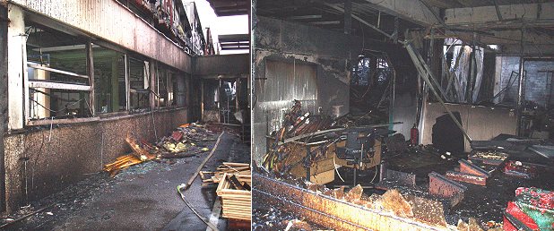 Millionenschaden vermutlich durch Brandstiftung (Fotos:Johannes-Anstalten Mosbach)(hr) (ap) Ein Schaden in Millionenhöhe ist gestern Abend beim Großbrand in den Schwarzacher Werkstätten der Johannes-Anstalten Mosbach entstanden. Gegen 19 Uhr hatte ein Heimbewohner den Brand gemeldet. Kurze Zeit später stand das gesamte Holzlager hinter dem Werkstattgebäude in Flammen. Die Feuerwehren aus dem Neckar-Odenwald-Kreis waren mit mehr als 100 Einsatzkräften vor Ort, konnten aber trotz hervorragender Arbeit nicht verhindern, dass die Flammen auf das Werkstattgebäude übergriffen. Verheerende Schäden entstanden vor allem im älteren Gebäudetrakt und in der Pulverbeschichtung. Hier kann vorerst nicht mehr gearbeitet werden. Die Polizei geht von Brandstiftung aus.