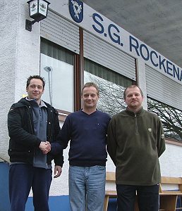 Wäsch sagt bis 2007 zu Spielausschussvorsitzender Thomas Achilles besiegelt die Vertragsverlängerung mit Rockenaus Trainern Mario Wäsch (li.) und Karlheinz Silbereis (re.) per Handschlag. (Foto: Menges)