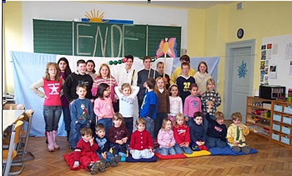 Sechstklässler präsentierten die kleine Raupe Nimmersatt (Foto: privat)(bro) (stf) Außergewöhnlichen Besuch erwartete die 6. Klasse der Dr. Weiß-Förderschule am Freitag, 3. Februar. Die elf Schülerinnen und Schüler führten vor den aufmerksamen Augen der Kinder der gelben Gruppe des Kindergartens St. Maria das Puppentheaterstück "Die kleine Raupe Nimmersatt" von Eric Carle auf. Mit den selbsthergestellten Requisiten zeigten die Schülerinnen und Schüler ihren Gästen die Suche einer kleinen, immer hungrigen Raupe nach Futter und deren Verwandlung in einen wunderschönen Schmetterling. Damit nach der Aufführung niemand hungrig nach Hause gehen musste, gab es zum Abschluss noch für alle selbstgebackenen Kuchen.