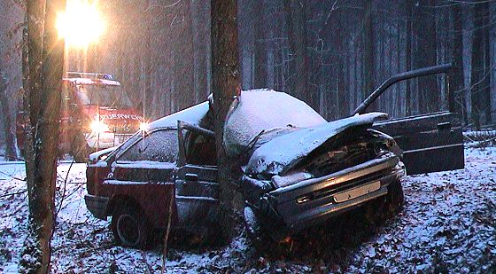 Seitlich gegen Baum geschleudert - Lebensgefahr (Foto:Richter)(hr) Lebensgefährliche Verletzungen erlitt eine 21-jährige Eberbacherin heute Morgen bei einem Unfall auf der Landesstraße 590. Die junge Frau war gegen 6.30 Uhr mit ihrem Ford Escort von Eberbach in Richtung Schwanheim unterwegs, als sie nach einer Rechtskurve auf Höhe des Kirchel-Parkplatzes ins Schleudern geriet. Der Wagen rutschte bei Schneeglätte nach links von der Fahrbahn, drehte sich und prallte mit voller Wucht seitlich an einen Baum.