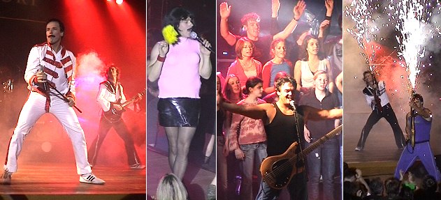 Die Rocklegende lebt weiter Johnny Zatylny mimte Freddie Mercury bis ins Detail. Der Jugendchor "Voices of Heaven" sang im Background. Mitunter spuckten sogar die Gitarren Feuer. (Fotos:Richter)(hr) Bereits zum dritten Mal hieß es gestern Abend in der Eberbacher Stadthalle "The Show must go on" mit der Queen-Tribute-Band "Merqury". Die fünf in Dresden beheimateten Musiker halten den Mythos "Queen" mit ihrem ebenso charismatischen wie exzentrischen Frontmann Freddie Mercury auch fast 15 Jahre nach dessen Tod am Leben. Bei "Merqury" tritt der Kanadier Johnny Zatylny an die Stelle des großen Freddie und verblüfft immer aufs Neue sowohl optisch als auch stimmlich: Zatylny mimt Mercury bis in die letzte Pose und kommt seinem Vorbild gesanglich so nahe, dass man fast meinen könnte, die Rocklegende selbst stehe auf der Bühne. Die gut gelaunten Fans am Rosenmontag gingen von Anfang an prima mit, und die Band sorgte mit Solo-Einlagen, Pyro-Effekten und einer klasse Performance dafür, dass die Stimmung bis weit nach Mitternacht brodelte. Mit dabei war auch wieder der Eberbacher Jugendchor "Voices of Heaven", der bei einigen Songs den Background beisteuerte.