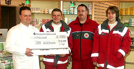 Schnelle Hilfe bei Herzattacken ermöglicht Unser Foto zeigt die kürzlich erfolgte Scheckübergabe, v.l. Apotheker Stephan Vogl, den 1. Vorsitzenden der DRK-Ortsgruppe Waldbrunn, Manuel Engert, Bereitschaftsleiter Joachim Leister und Schriftführerin Sabrina Lenz.(tb) Bisher fehlte in Waldbrunn noch immer ein so genannter Defibrillator, der bei Herzkammerflimmern, Vorhofflimern oder Herzrhythmusstörungen die die Herzmuskeln wieder in eine geordnete Funktion überführen kann. Wenn solche Attacken ohne Vorankündigung und obendrein mitten in der Nacht eintreten, ist schnelle Hilfe oft lebensrettend.