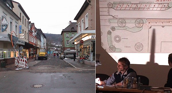 Wieder knappe Mehrheit für Umgestaltung der Friedrichstraße - Sondersitzung am 16. März Die Baustelle Friedrichstraße, rechts Dr. Harald Grote bei der Vorstellung seines Planentwurfs. (Fotos:Richter)(hr) Aller guten Dinge sind bekanntlich drei - und so wurde gestern zum dritten Mal innerhalb weniger Monate im Gemeinderat über die Frage abgestimmt, ob die Friedrichstraße nach den derzeitigen Leitungsarbeiten umgestaltet oder wieder in ihrem bisherigen Zustand hergestellt werden soll. Bei der ersten Abstimmung am 27. Juni 2005 war eine Umgestaltung knapp abgelehnt worden (wir berichteten). Bürgermeister Bernhard Martin setzte das Thema am 29. September zum zweiten Mal auf die Tagesordnung und bekam eine knappe Mehrheit für seinen Antrag zur Umgestaltung der Straße für Mehrkosten von rund 175.000 Euro (wir berichteten). Was damals nicht bekannt war: Aufgrund eines "Kommunikationsfehlers" zwischen einem externen Fachbüro und Stadtbauamt waren diese Mehrkosten falsch beziffert. Sie betragen tatsächlich nach derzeitiger Schätzung 209.000 Euro. Hinzu kommt noch eine Kostensteigerung im Bereich der Leitungsarbeiten von 35.000 Euro.