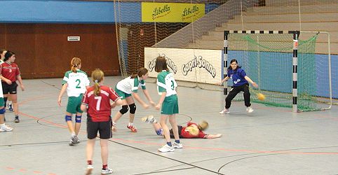 Verdienter Sieg für Handballmädchen der SGH Waldbrunn/Eberbach (Foto:Claussen)(jc) Einen verdienten Erfolg erkämpfte sich heute die weibliche D-Jugend der SGH Waldbrunn/Eberbach in der Rhein-Neckar-Halle. Trotz dünner Besetzung war man mit Siegeswillen nach Eppelheim gereist, kam aber zunächst nicht richtig in die Gänge und die Mannschaft des Tabellenschlusslichtes TV Eppelheim zog mit 6:3 davon. Erst nach einer Auszeit seitens des SGH-Trainerduos Bianca Michalske und Reinhold Weis wachte die SGH auf und brachte den TV zunehmend in Schwierigkeiten. Beim 10:10 kippte das Spiel langsam zugunsten des Odenwald-Teams. Halbzeitstand:12:14 für die SGH.