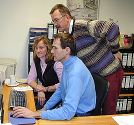 Mitarbeiter der VHS Ludwigshafen zu Gast in Eberbach (Foto:Eberb.Ztg.)(bro) (vhs) Das Netzwerk der Volkshochschulen untereinander zu pflegen, ist eine der Maximen von VHS-Leiter Erol Weiß. Er tut dies bereits seit Jahren in seiner Funktion als Vorsitzender der Region "Unterer Neckar", der die sechzehn Volkshochschulen des Rhein-Neckar-Kreises und des Odenwaldkreises, unter anderen die Volkshochschulen Mannheim und Heidelberg, angehören. So setzte er sich auch sehr dafür ein, dass sich die Volkshochschulen Baden-Württembergs im Jahr 2000 bei der Umstellung ihrer Verwaltungssoftware von der Dos-Version auf die Windows-Version zusammentaten, um einen deutlichen Rabatt beim Hersteller zu erzielen. "Kollegialer Austausch ist wichtig. Denn es kommt auch immer was zurück." So liegt dem Leiter der VHS Eberbach-Neckargemünd auch viel daran, dass seine Mitarbeiterinnen in stetem Kontakt mit anderen Volkshochschulen - auch in Fortbildungen - ihr Wissen erweitern und ihre Erfahrungen weitergeben. Am Donnerstag, 9. März, war zum Beispiel die VHS Ludwigshafen mit drei Mitarbeitern zu Gast bei der VHS in Eberbach. Dieser Kontakt kam durch eine gemeinsame Fortbildung der Verwaltungsmitarbeiterinnen zustande. Die Ludwigshafener Kollegen Wolfram Schwan, Regina Brauch und Sandra Heß ließen sich von den Eberbacher Kolleginnen einen Vormittag lang in der Verwaltungssoftware WINBASys schulen. Kollegiale Beratung zeigt sich aber auch an einem anderen Beispiel der VHS Eberbach-Neckargemünd: Sibylle Muff, eine VHS-Mitarbeiterin, erstellte eine komplizierte Dokumentenvorlage, die im Rahmen der Landesstatistik notwendig geworden war. Diese Vorlage wurde vom Dachverband für so gut befunden, dass sie allen baden-württembergischen Volkshochschulen zur Verfügung gestellt wurde.