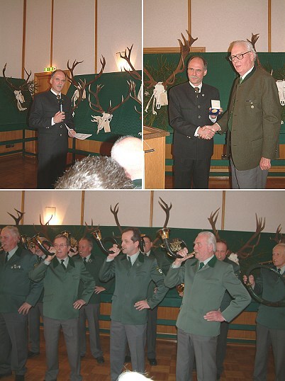 Trotz Bemühungen keine Verbesserung der Verbreitung des Rotwildes Dr. Andreas Wiese, der Geschäftsführer der Vereinigung der Rotwildjäger im Odenwald bei der Besprechung der Trophäen im Kleinen Saal der Stadthalle. Alfred Hubertus Neuhaus erhielt für seine Verdienste die Goldene Vereinsmedaille. Für einen adäquaten musikalischen Rahmen sorgten die Eberbacher Jagdhornbläser unter der Leitung von Sigmar Richter.(Fotos:Wörner)(tw) (aw) Anlässlich der alljährlich in der Eberbacher Stadthalle stattfindenden Hegeschau legten die Rotwildjäger im Odenwald gestern wieder Rechenschaft ab. Mit Vorlage der Unterkiefer bei den weiblichen Stücken und den Trophäen der männlichen, wurde der vom hessischen Jagdgesetz und von den Behörden in Baden-Württemberg und Bayern geforderte körperliche Nachweis erbracht. Die Auswertung der Kiefer und Trophäen spiegelt die Bestandsstruktur des Rotwildes im 46.000 ha großen Rotwildgebiet Odenwald wieder und lässt wertvolle Rückschlüsse auf seine Qualität und seine Höhe zu.