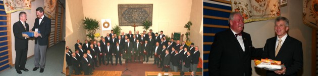 Konzert und Empfang zum 15-jährigen Dirigentenjubiläum Voll des Lobes waren MGV- Vorsitzender Wilfried Kappel, Pfarrerin Angelika Bless und Bürgermeister Roland Schilling über den langjährigen Dirigenten Andreas Walz (Fotos: Böhm)(ub) (MJB) Ein gemeinsames Chorkonzert der beiden Männerchöre aus Schwanheim und Brombach begeisterte die Zuhörerinnen und Zuhörer in der bis auf den letzten Platz besetzten evangelischen Kirche in Schwanheim. Anlass für das gemeinsame Singen war die 15-jährige, überaus erfolgreiche Chorleitertätigkeit von Dirigent Andreas Walz beim MGV Schwanheim. Das Konzert wurde am nächsten Tag in der Kirche in Brombach wiederholt.