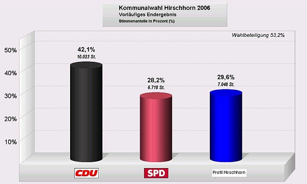 Neue Wählervereinigung sahnt kräftig ab (Quelle:Stadt Hirschhorn)(hr) Eine faustdicke Überraschung brachte die gestrige Stimmenauszählung der Kommunalwahl in Hirschhorn. Das neue Wählerbündnis "Profil Hirschhorn" eroberte auf Anhieb mit 29,6 Prozent der Stimmen fünf Sitze in der Stadtverordnetenversammlung. Die CDU, bisher mit 10 Sitzen in der absoluten Mehrheit, verlor gleich drei Mandate, blieb aber mit 42,1 Prozent stärkste Kraft. Die SPD musste zwei Sitze abgeben und landete mit 28,2 Prozent auf Platz drei.