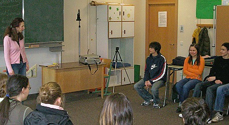 Jetzt rede ich - Rhetorik und Kommunikation für Schüler Dozentin Cornelia Albert und Schüler der neunten Klasse.(Foto: VHS)