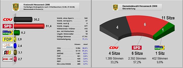 Verhältnismäßig gute Wahlbeteiligung in Hesseneck (Quelle:Odenwaldkreis)(jc) Eine vergleichsweise gute Wahlbeteiligung (71,1 Prozent) war am vergangenen Sonntag bei den Kommunalwahlen in Hesseneck zu verzeichnen. Zehn Punkte auf 57,2 Prozent büßte die SPD-Fraktion von Bürgermeister Thomas Ihrig ein. Die CDU konnte leicht zulegen. Erstmals in Hesseneck präsent, erreichten die Grünen 9,6 Prozent.