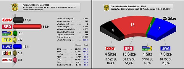 SPD mit absoluter Mehrheit (Quelle:Odenwaldkreis)(jc) Die absolute Mehrheit der SPD von 51,4 Prozent in Beerfelden stützt sich auf einem Sitz in der Stadtverordnetenversammlung. In der Stadtverordnetenversammlung sitzen künftig 13 SPD-Abgeordnete sieben der ÜWG und vier der CDU sowie ein Vertreter der Grünen.