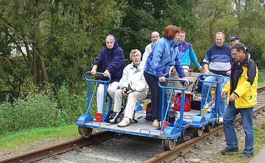Probefahrt kam gut an - Aktionstage im Sommer (Foto:privat)(hr) (mn) Immer wieder ist die Odenwaldbahnstrecke Erbach - Eberbach in den Schlagzeilen, erst Modernisierung, dann Stilllegungsgerüchte. Jetzt gibt es schon wieder neue Pläne für diese besonders reizvolle Bahnstrecke. Ein Veranstalter aus der Pfalz, möchte an einigen Sonntagen im Sommer Draisinenfahrten zwischen Erbach und Eberbach anbieten. Dieses Konzept ist auf der Strecke Altenglan - Staudernheim im Pfälzischen Glantal ein großer Erfolg. Einziger Unterschied, die Strecke dort wurde bereits vor Jahren stillgelegt. Gefahren werden soll mit Fahrraddraisinen, auf denen bis zu vier Personen Platz haben und zwei davon in die Pedale treten müssen.